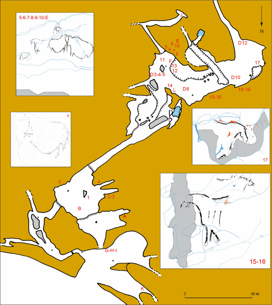 Les recherches y recensent 59 unités graphiques (animaux, signes, motifs indéterminés, marques rouges), avec un corpus notable de chevaux, mammouths, bison et des signes triangulaires aux bords arrondis, ainsi que des mains rouges. Des datations radiocarbone sur un cheval situent au moins une partie des tracés vers 26 666 ± 864 à 27 255 ± 413 cal BP.