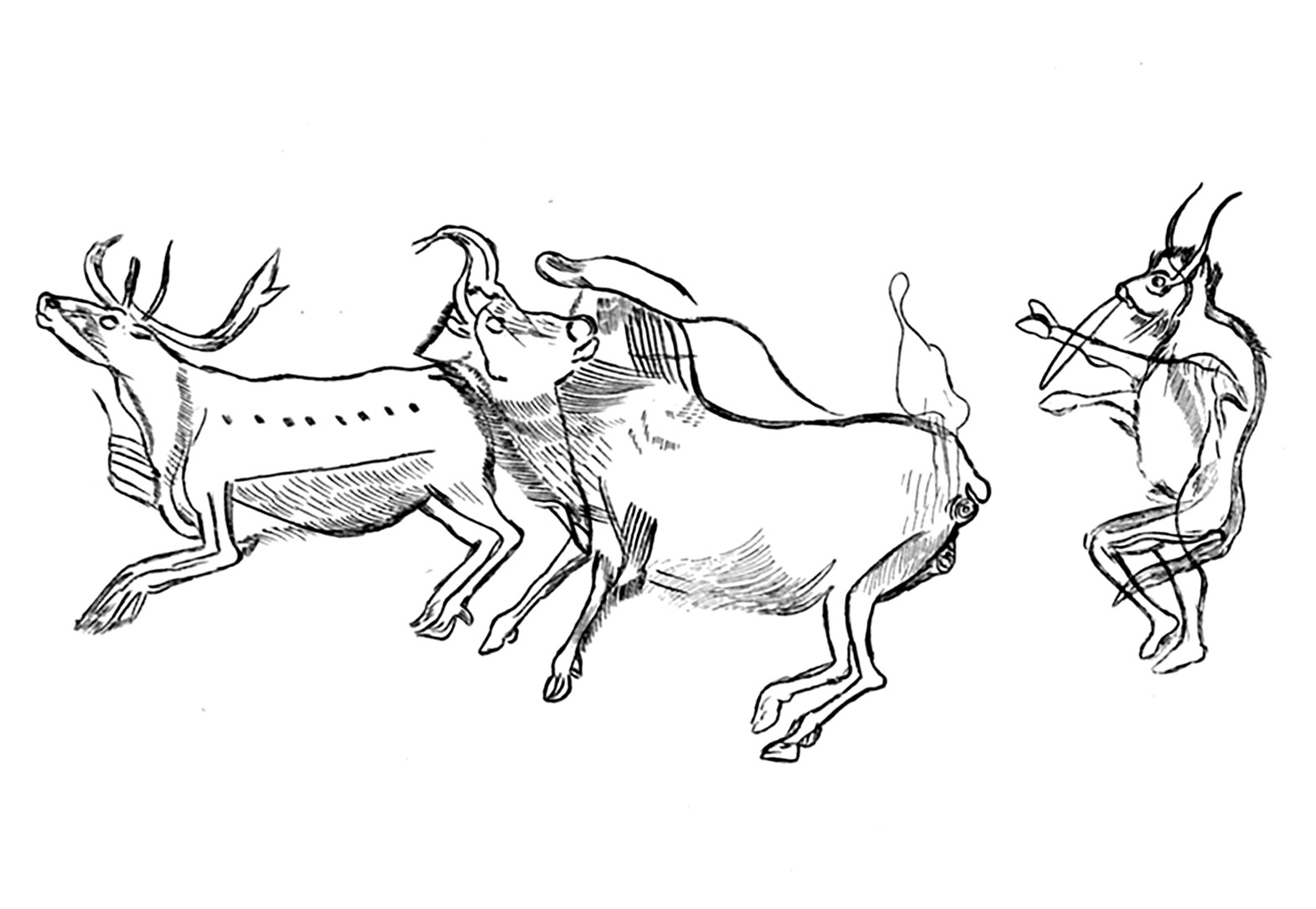 Dans la grotte des Trois-Frères on présente généralement cette figure anthropomorphe comme une sorte de sorcier ou un chaman en transe qui danse devant des animaux (figure 1). C’est un peu vite oublier que ce n’est qu’une partie du panneau gravé (figure 2) où le chaman n’est pas vraiment l’élément central. De plus, les animaux ne sont pas orientés comme le sorcier. Il semble plutôt évoluer au milieu d’un troupeau, à quatre pattes avec une peau de bête sur le dos. Cette posture évoque beaucoup plus celle d’un chasseur caché au milieu d’un troupeau que celle d’une danse chamanique ou rituelle.