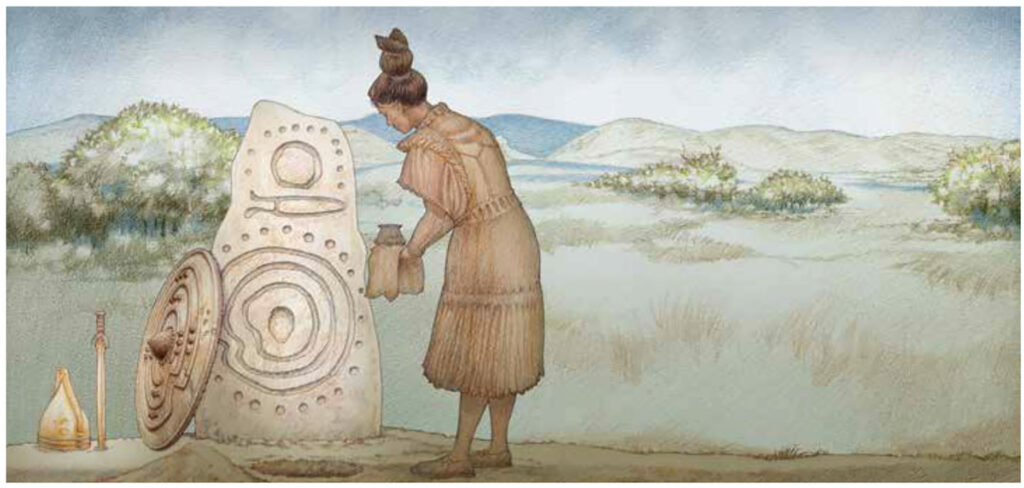En première partie, en début de parcours, l’exposition met à l’honneur les imposantes stèles de Buoux (Vaucluse). Gravées à la fin de l’âge du Bronze, elles figurent des boucliers, épées et casques, emblèmes du guerrier héroïque et sont les témoins des échanges culturels entre la Provence et la péninsule Ibérique.