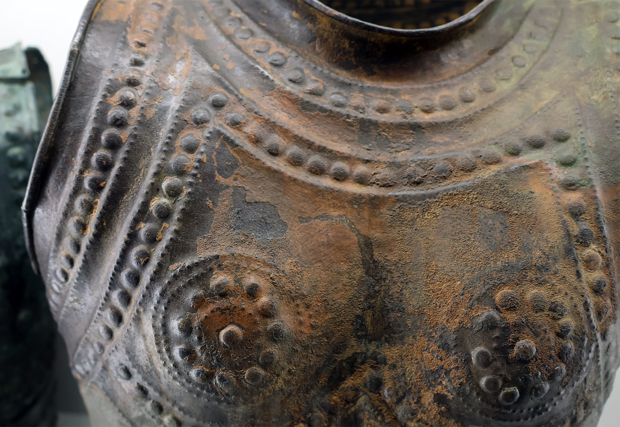 Dans la nature, il se présente sous la forme de pierres, parfois colorées comme la malachite ou l’azurite. Récolté à l’aide d’outils en bois de cerf et de pierre, le minerai est concassé, chauffé à environ 1100°C et purifié afin d’en extraire le métal de cuivre. À la fin du 3e millénaire, on découvre qu’en mélangeant ce métal à de l’étain, il devient plus dur et résistant : c’est ainsi que naît le bronze, un alliage doré et robuste composé d’environ 85% de cuivre et 15% d’étain.