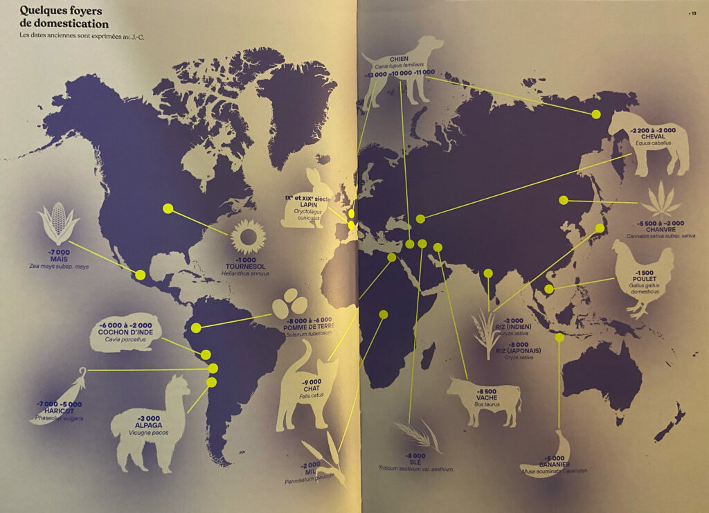 Valérie Chansigaud, commissaire scientifique de l’exposition et autrice des principaux textes, propose un regard très transversal de la domestication balayant ses enjeux et son histoire. En complément, un ensemble de focus thématiques ouvrent des fenêtres curieuses sur des histoires, des sujets de recherche connexes, des œuvres d’artistes… autant d’exemples qui traduisent le champ immense d’un tel sujet. La maquette très lisible et contemporaine sert harmonieusement l’articulation entre les rubriques en faisant un livre agréable à lire ou à parcourir, indépendamment de la visite de l’exposition. Teddy Belier en a assuré la direction artistique et la réalisation. Les imprimeries Escourbiac situées dans le Tarn ont réalisé la fabrication avec un savoir-faire d’exception.