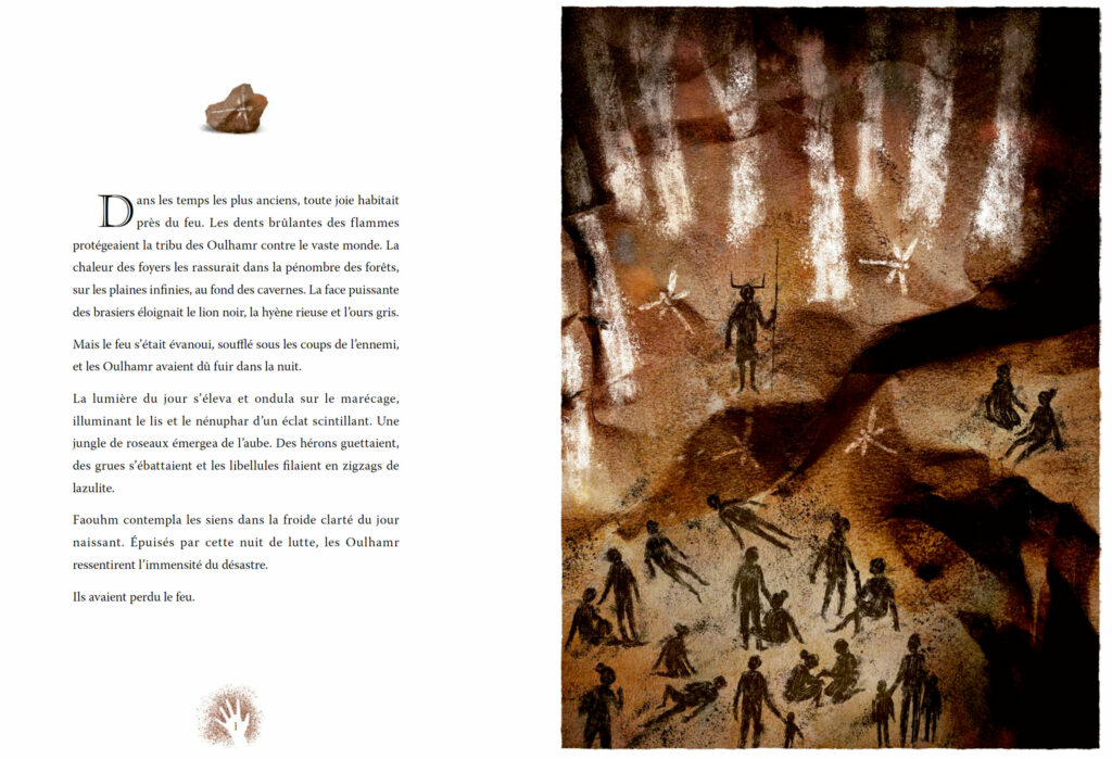 Dans les temps plus anciens ‘après du feu. Les dents brulantes des flammes protégeaient la tribu des Oulhamr contre le vaste monde. La chaleur des foyers les rassurait dans la pénombre des forêts, sur les plaines infinies, au fond des cavernes. La face puissante des brasiers éloignait le lion noir, la hyène rieuse et l’ours gris.