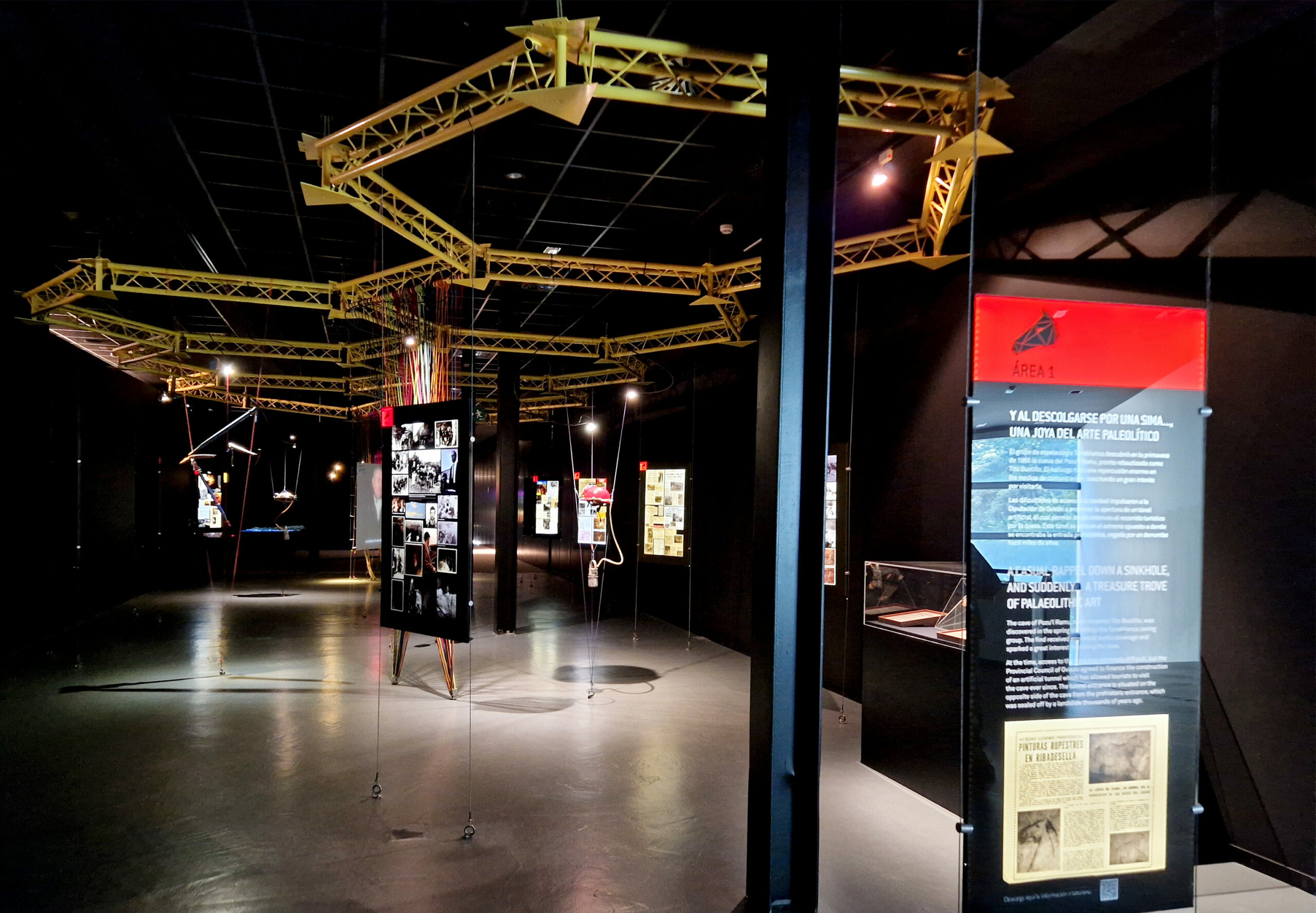 L’organisation du Centre repose sur un parcours muséographique structuré en plusieurs espaces thématiques. Une première zone introduit le contexte géographique, historique et archéologique de la région, présentant les occupations humaines qui se sont succédées durant le Paléolithique supérieur. Le cœur de l’exposition permanente est consacré aux représentations rupestres de Tito Bustillo : panneaux ornés, techniques de gravure et de peinture, matières colorantes, motifs zoomorphes et figures féminines emblématiques. Grâce à des reproductions fidèles, des dispositifs audiovisuels et des modèles 3D, les visiteurs peuvent explorer les galeries inaccessibles au public tout en comprenant les gestes artistiques et symboliques des groupes préhistoriques.