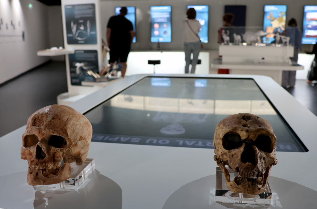 Il est entouré de plusieurs photographies de néandertaliens reconstitués par Elisabeth Daynes.