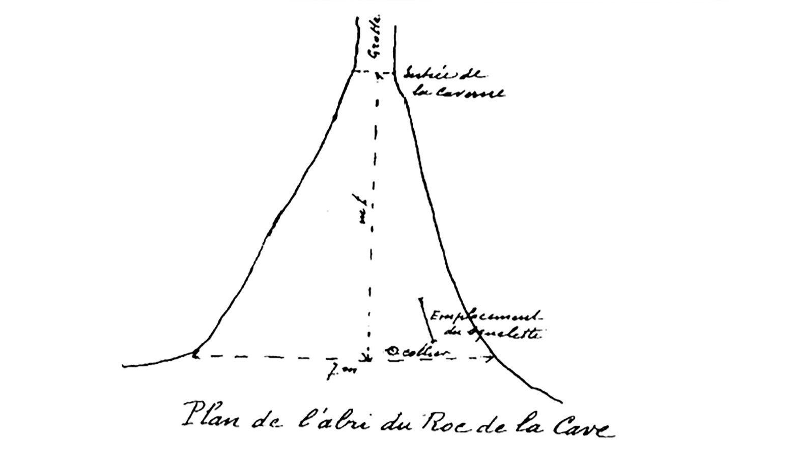 C’est en 1928 que M. Vialle a découvert le squelette d’un Homo sapiens à l’extérieur de la grotte du Roc-de-Cave. Il n’existe pas de compte rendu des fouilles. Le 23 décembre 1929 le site est classé.En 1934 J. Blanchard publie la découverte d’une lampe à graisse paléolithique. Les fouilles permettent également de mettre à jour des artefacts appartenant à plusieurs phases du Paléolithique supérieur (Solutréen, Magdalénien). En 1949 le préhistorien Denis Peyrony attribue le fossile humain à l’Azilien, il a depuis été daté de 11 210 ± 140 BP (Dominique Gambier).